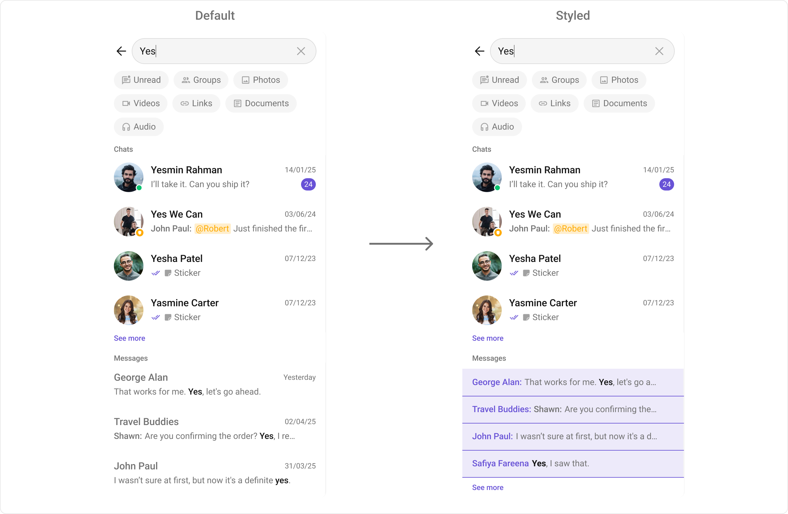 To fit your app’s design requirements, you can customize the appearance of the CometChatSearch component. We provide exposed methods that allow you to modify the experience and behavior according to your specific needs.