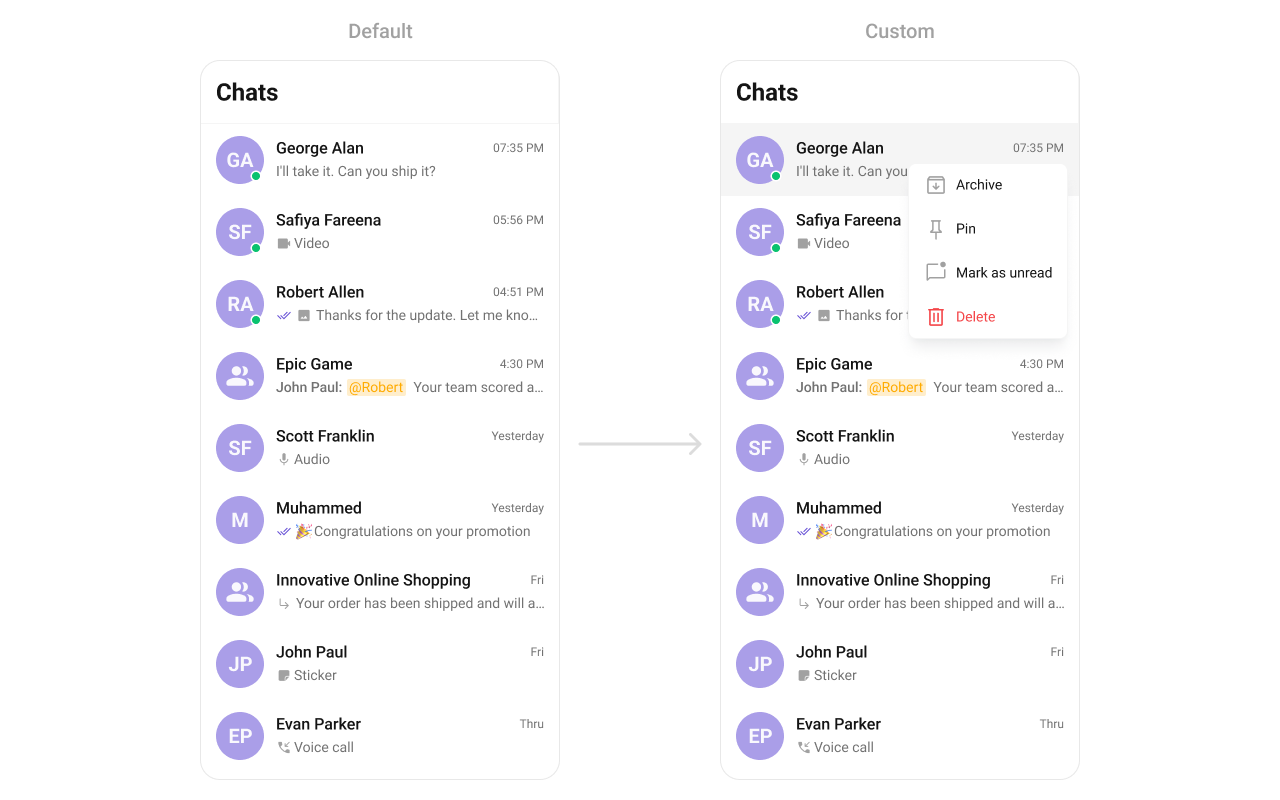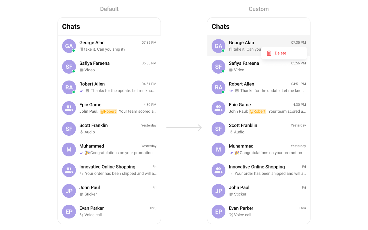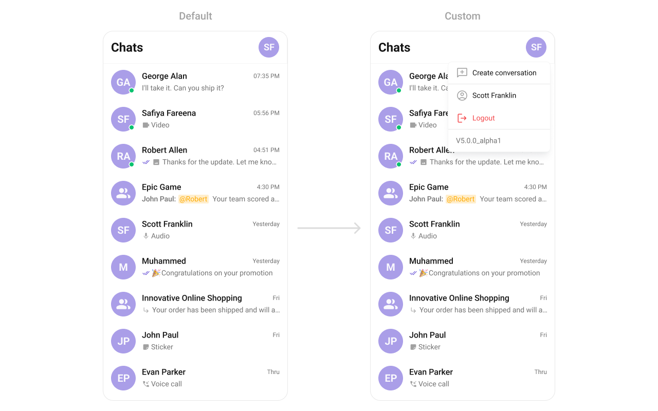 To fit your app’s design requirements, you can customize the appearance of the conversation component. We provide exposed methods that allow you to modify the experience and behavior according to your specific needs.